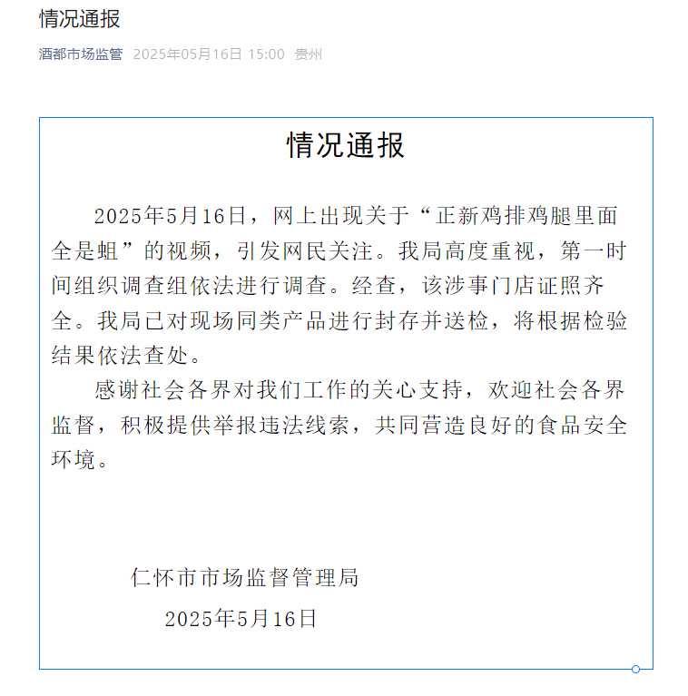 涉事门店店员在相关视频中称,顾客“早上买下午找我们,我们当时报警了,并已经退钱给他了”,视频是“围观者拍摄,不是购买者本人拍摄”。5月16日下午,仁怀市市场监督管理局发布情况通报:2025年5月16日,网上出现关于“正新鸡排鸡腿里面全是蛆”的视频,引发网民关注。我局高度重视,第一时间组织调查组依法进行调查。经查,该涉事门店证照齐全。我局已对现场同类产品进行封存并送检,将根据检验结果依法查处。